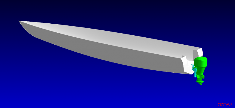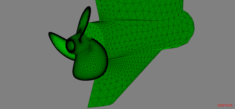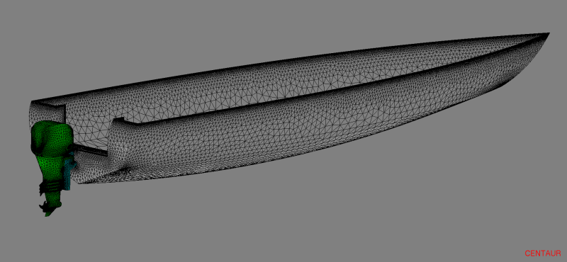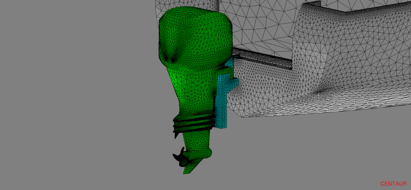 This geometry represents a motorboat with an outboard motor. All the details of the motor along with the mount have been included in the mesh generated using CENTAUR.