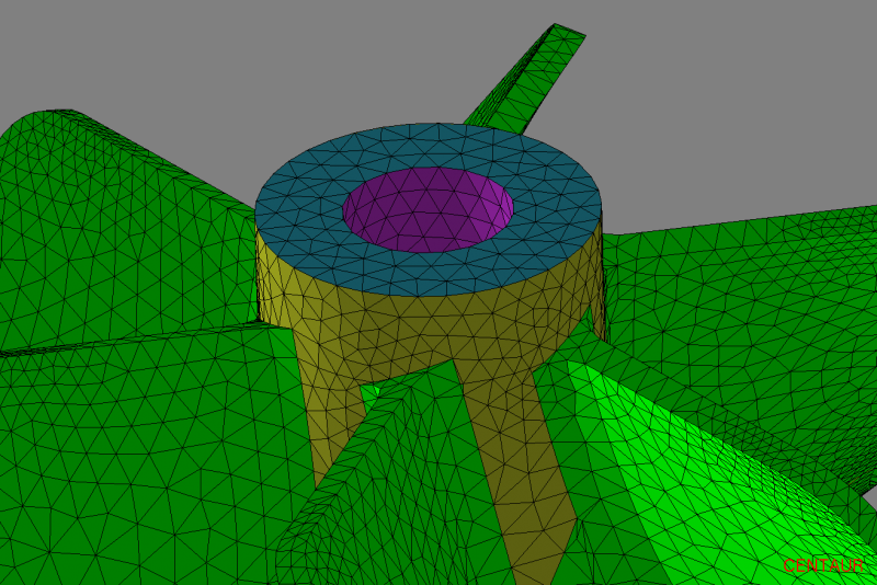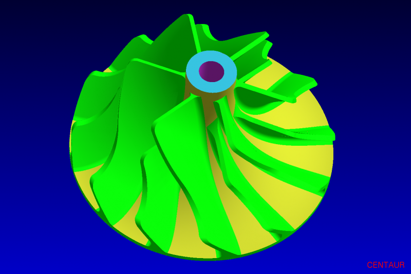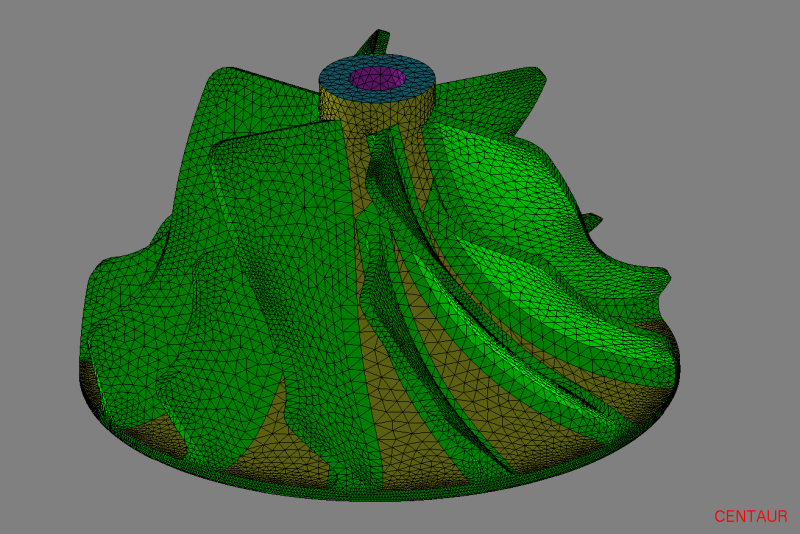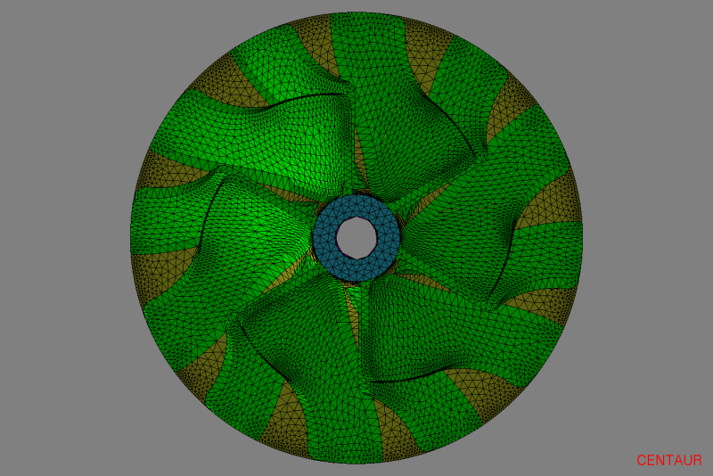 This geometry represents the rotor disk (impeller) of a centrifugal compressor. A mesh was generated using CENTAUR for the solid part.