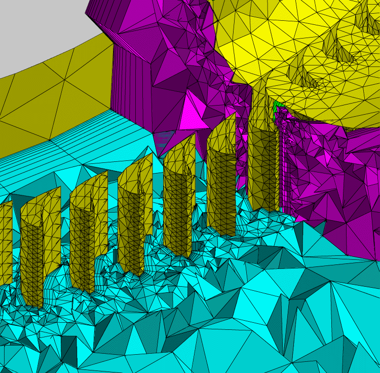 This geometry consists of several small blades equally spaced circumferentially inside a toroidal housing. The case presents a challenge to grid generation efforts due to very disparate length scales. CENTAUR was used to automatically mesh this geometry with only minimal input required from the user. Fluid flows in through both ends of the housing and out through a right-angled bend past the blades.