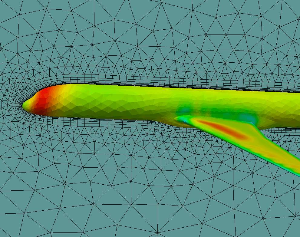 The mesh in the wall regions adjusts the position of its layers based on the y+ values calculated on the aircraft surface. Notice the boundary layer mesh for the nose of the aircraft before and after the redistribution. The initial mesh produced a y+ value much higher than the desired value. After redistributing the mesh, the final y+ value was lowered to near the goal.