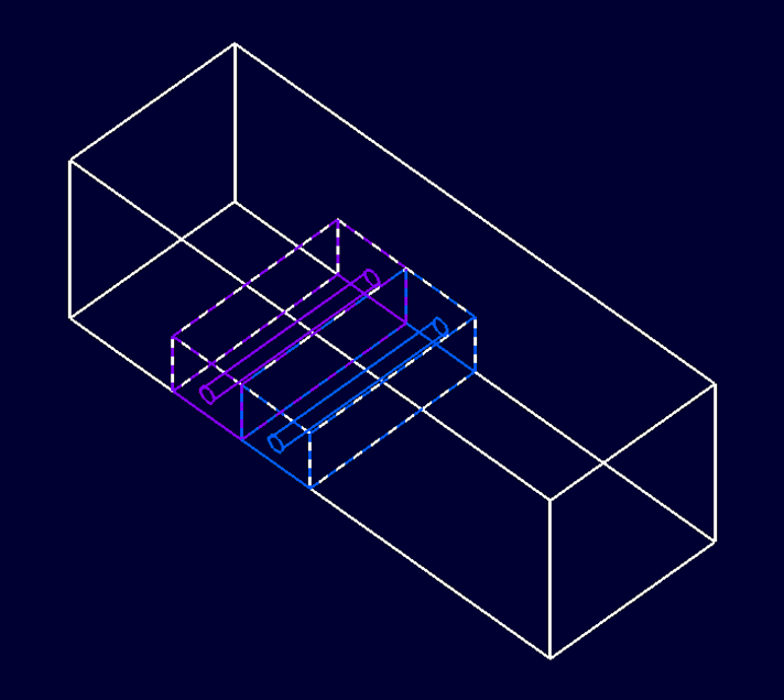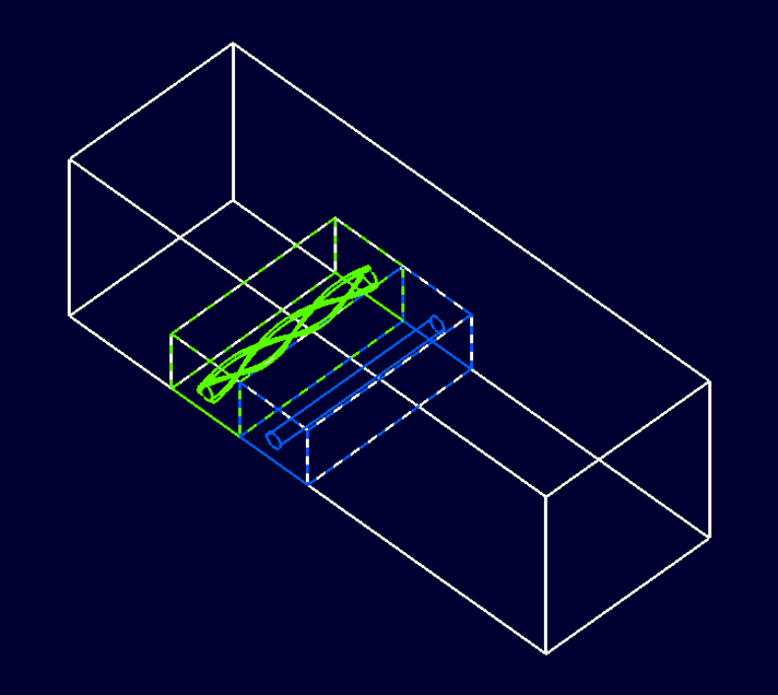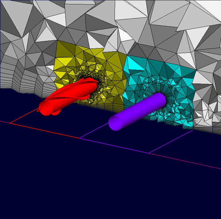 This geometry regards the flow over two pipelines along the ocean floor. In order to prevent vortex induced vibrations, helical strakes are placed along the pipelines. Modular mesh generation can be used to replace the pipeline geometry with a straked one without regenerating the entire grid.