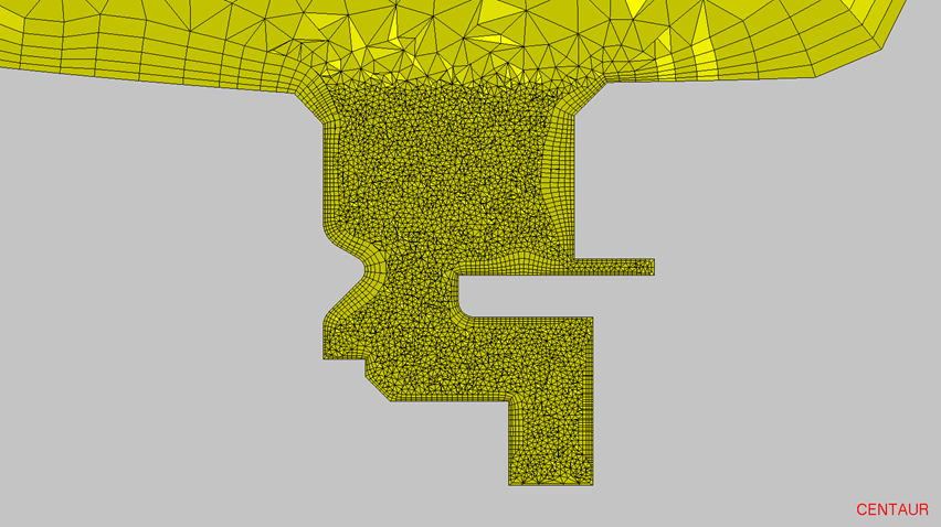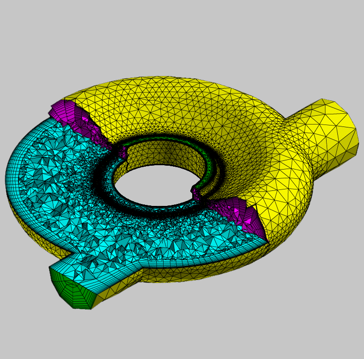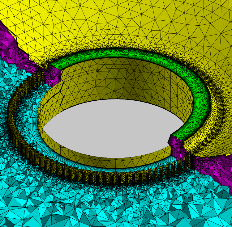 All element sizes for this complex configuration were determined based on the geometry and a smooth size transition was automatically ensured from the small edges near the blades to the large length scales near the circular inlets. The prisms naturally follow these length scale changes and a smooth transition to the tetrahedra is also achieved.