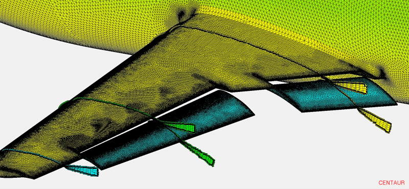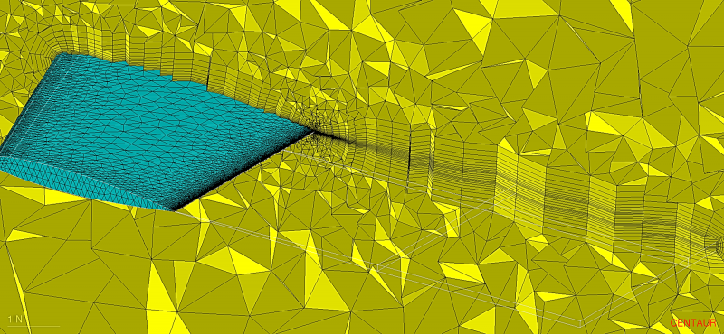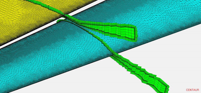 CENTAUR has the capability to generate structured mesh layers appropriate to resolve the wake regions. Prismatic or hexahedral layers can “grow” from the sides of a wake surface or a wake block. Structured wake meshes are commonly used along sharp and blunt trailing edges of wings or blades to accurately model the transition from the boundary layer to the wake.